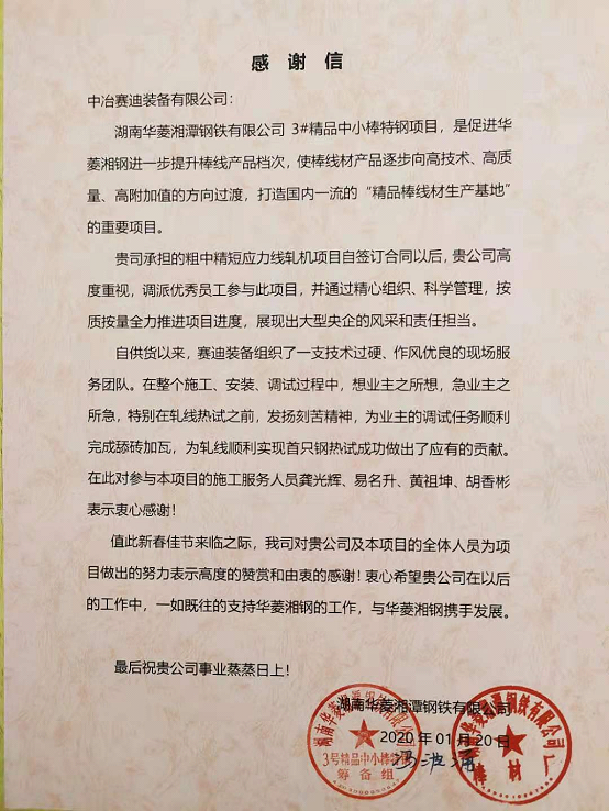 此項目從簽訂合同以來,賽迪裝備積極應(yīng)對,精心組織,全力配合業(yè)主現(xiàn)場生產(chǎn)計劃,截止到2019年12月26日,該項目在線和備件共42臺套軋機全部運抵現(xiàn)場,陸續(xù)安裝、調(diào)試并一次性熱試成功,最終受到業(yè)主的好評,并專程發(fā)來了感謝信。