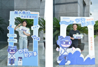 7月8日,校招新員工們懷揣期待陸續抵達公司。大家首先在創意打卡區留下入職首照,隨后在簽名墻上留下職業生涯的第一個“印記”。他們拿起筆,寫下的不僅有自己的名字,更在筆尖流淌出對未來職業生涯的美好愿景,字里行間滿是對未來的憧憬與向往。